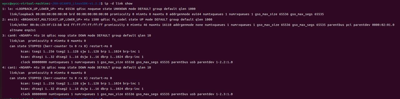 重新拔插 CAN FD 设备后,执行以下命令确认设备被识别: